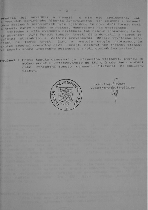 Nyní je nezbytné připomenout, že od 6.3. do 26.7.2025 NIKDO NEMOHL NAHLÍŽET DO SPISU, což znamená, že nikdo, ani advokáti, nevěděli, že dne 2.4.2025 bylo zastaveno trestní stíhání Jiřího Forejta (viz. Příloha B.). Je tedy zjevné, že od 2.4.2025 jsem jak já, tak moje manželka, byli stíháni z vraždy každý zvlášť, a ani jeden z nás nemohl vědět, že náš společný „spolupachatel“ již stíhán není.Myslím si, že nazvu-li tento postup „uváděním klamavých skutečností“, nebudu daleko od pravdy. Jenže, uvádění klamavých skutečností ze strany policie, je praktika nezákonná a zákonem zakázaná.