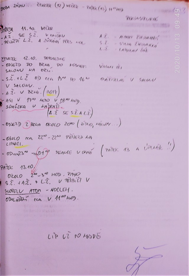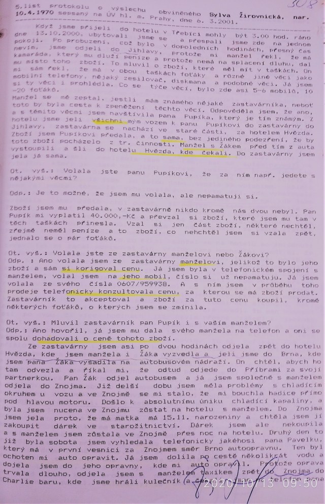Na listu číslo 308 popisuje, jak jsme se okolo 3 hodiny ráno dne 13.10.2025 ubytovali v hotelu Atom v Třebíči. Ano, má ex-manželka potvrdila skutečnost, že cca 45 minut po smrti Pišty v Praze, jsme se ubytovali v hotelu v Třebíči, tedy 180 km od místa činu.