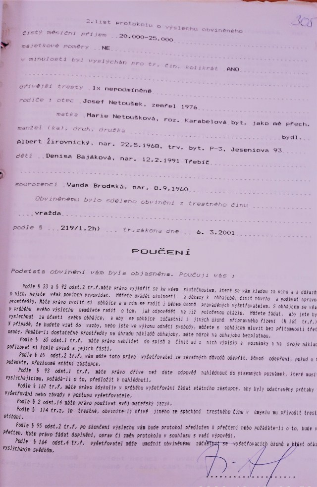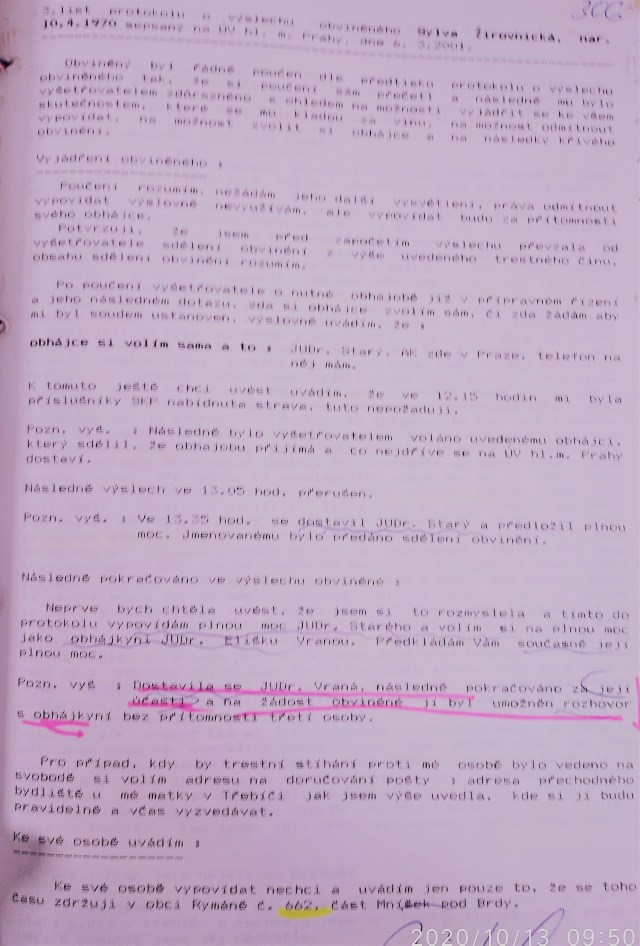 Nicméně, velmi důležitý údaj je, že jsem byl panem Pavlíkem vyslýchán od 13:40-14:58 hodin, a to v přítomnosti JUDr. Vrané, advokátky, která měla ode mě podepsanou plnou moc.