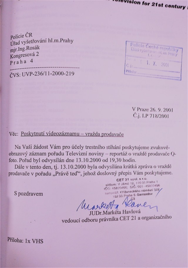 Navíc, když jsme od prosince 2000 měli doma k dispozici Protokol o vyšetřovacím pokusu, který jsme získali v rámci korupčních nákupů od policajtů (dlužno dodat jiných než z mordparty), ačkoliv dnes si myslím, že nám to bylo podstrčeno v rámci tzv. „vhodné operativní kombinace“.