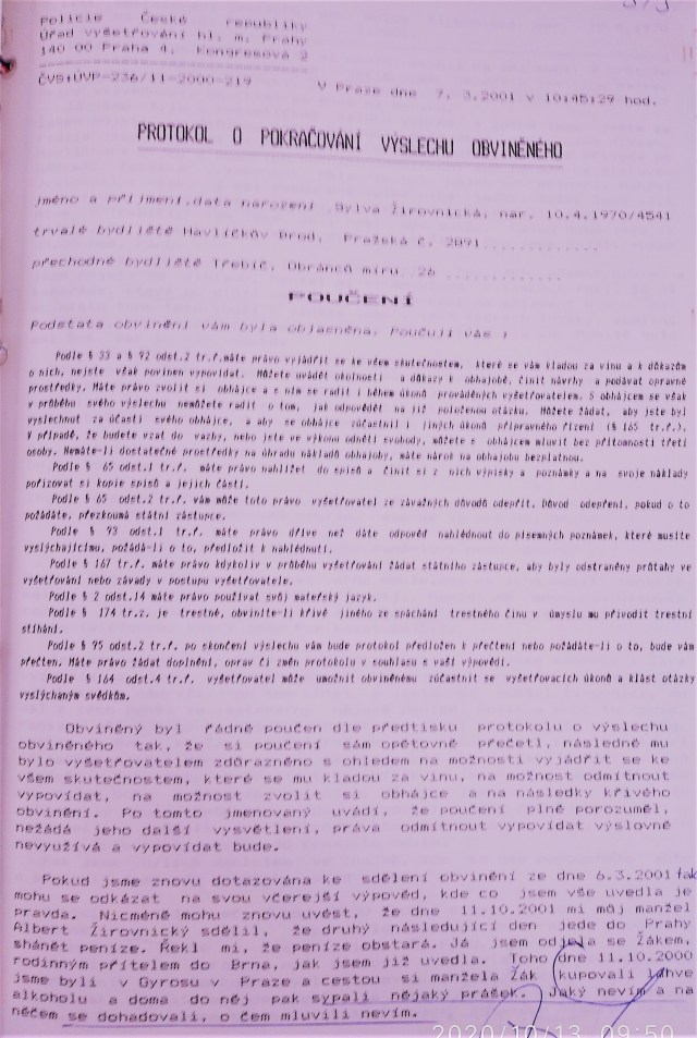 Ano, je též na místě připomenout, že má ex manželka vypovídala ještě několikrát, a to ve dnech: 7.3. a 11.7.2001. Abych byl tedy otevřený a transparentní, jako Přílohu A) zde přikládám Protokol ze dne 7.3.2001, listy čísel 313-316, na kterých má exmanželka popisuje průběh usmrcení Pišty, jak jsem jí ho „měl vyprávět“ v hotelu Grand ve Znojmě, po shlédnutí televizních novin, dne 14.10.2001. Nechť se na mě čtenář již nezlobí, ale nebudu se vracet k tomu, že tato výpověď „z doslechu (hearsay evidence)“ je objektivně nepravdivá, když policajti neověřili ani skutečnost, že ve Znojmě NEEXISTUJE HOTEL GRAND, ve kterém jsme se měli dívat na televizní noviny, které 14.10.2025 v televizi NEBĚŽELY.