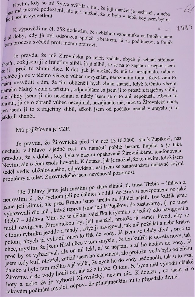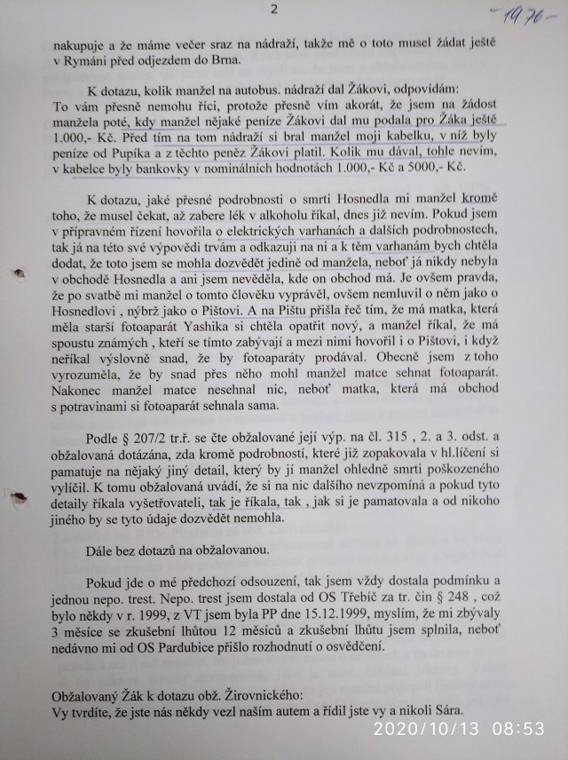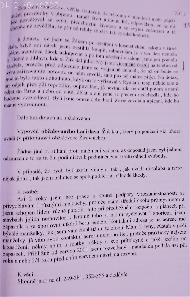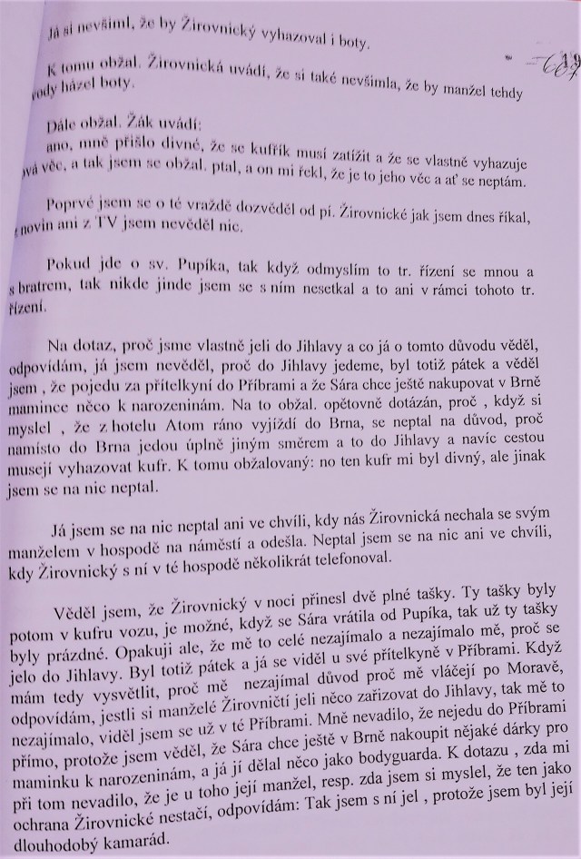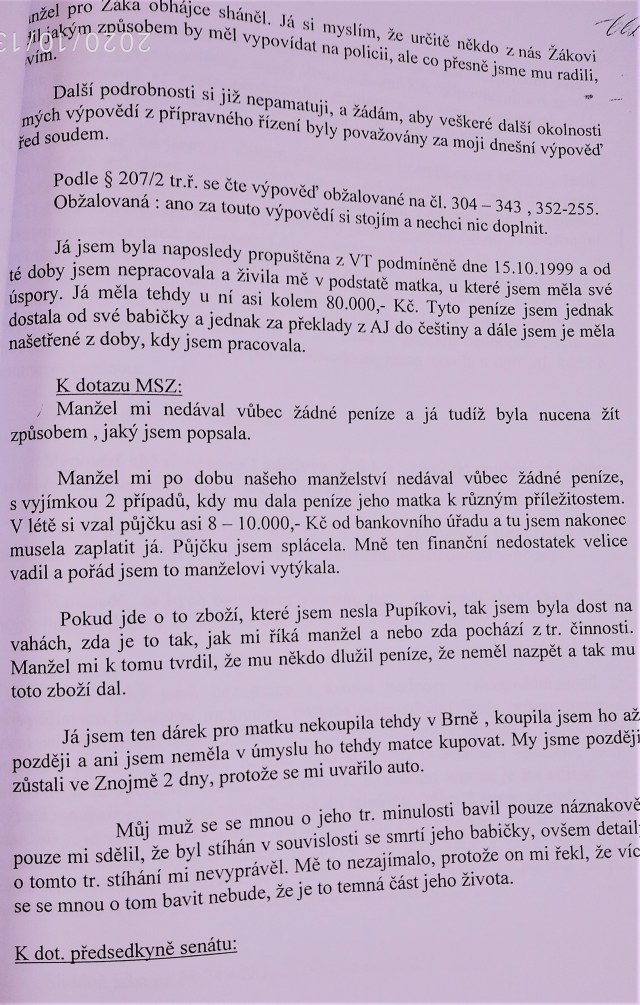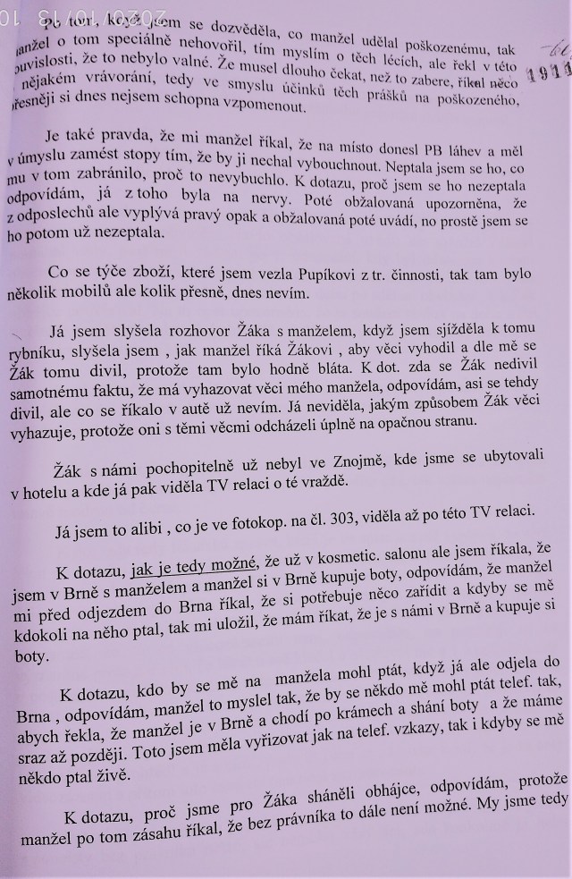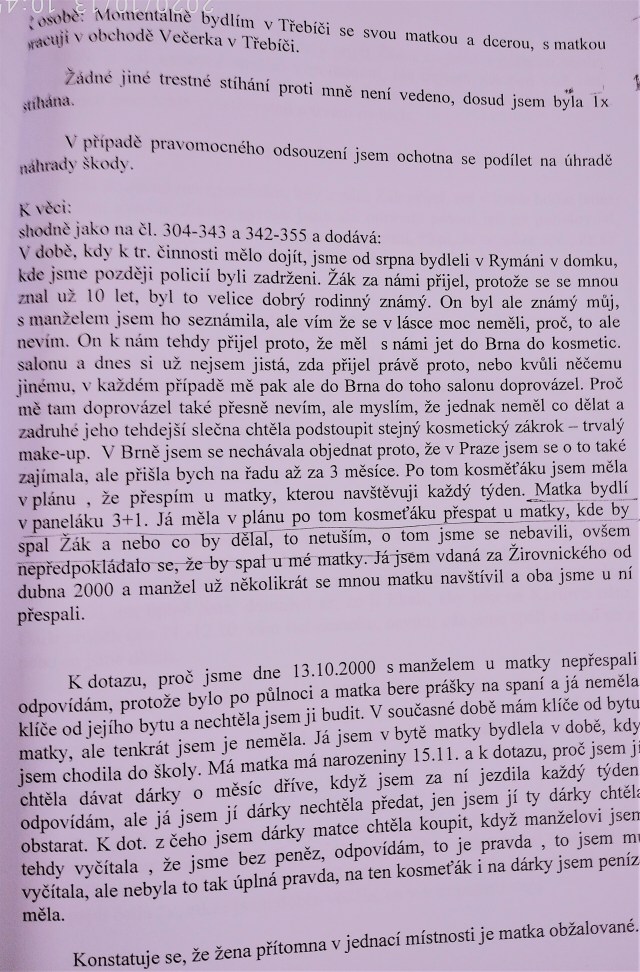 Nejprve úvodem výslechu uvádí, že: „poslední dva roky byla nezaměstnaná, ale má příjem 20.-25.tisíc čistého, jede na kosmetiku do Brna, přespáváme v hotelech a jíme v restauracích, ale já nepřispívám do rodinného rozpočtu…. Z kosmetiky v Brně jedou do Třebíče a z Třebíče do Jihlavy, ale zůstává na Moravě, neboť se chce zastavit den poté, za matkou a dcerou v Třebíči, ale přesto odjela do Jihlavy shánět nocleh….Po odjezdu z hotelu Atom jsme měli jet do Jihlavy, protože mi tam někdo dlužil peníze, a dal mi za to zboží, ačkoliv jsem s taškami se zbožím měl přijet do Havlíčkova Brodu den předtím…“ A nakonec jsem: „nechal manželku samotnou (ačkoliv jsem jí dle jejích slov nevěřil) vykládat tašky u zastavárníka a samotnou jí je nechávám zpeněžovat což koordinuji po mobilu“ (který jsem tehdy nejen neměl, ale já ho ani nechtěl). „Házeli jsme věci do rybníka, boty a kufřík a další (proč na Moravě, kdy veškeré věci popisuje jako „zjevené věci“; Auto bylo její, ale náhle se v kufru objevily boty kufr apod., ačkoliv před tím popisovala, jak jsme všichni dávali do kufru tašky, co jsem přivezl z Prahy a ona pak s těmi taškami manipulovala u zastavárníka.“