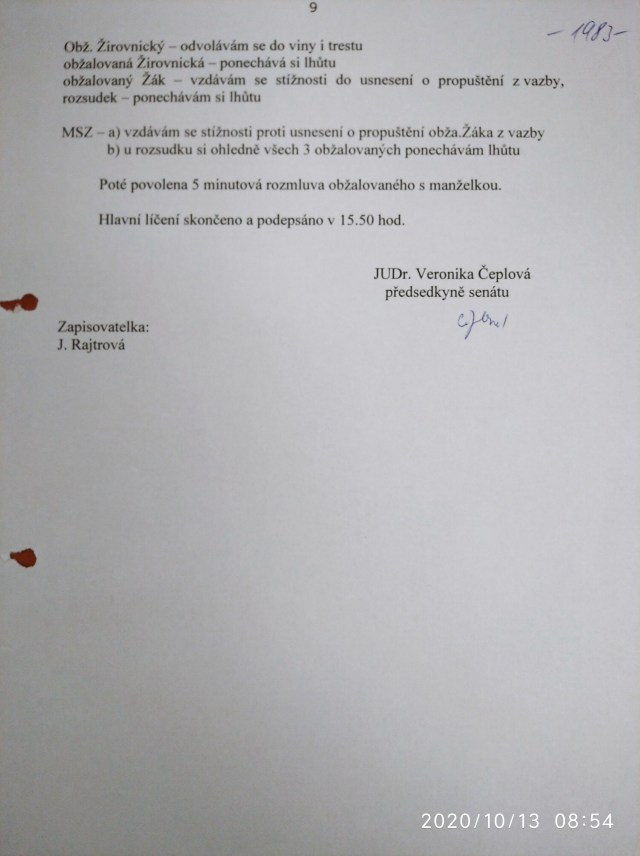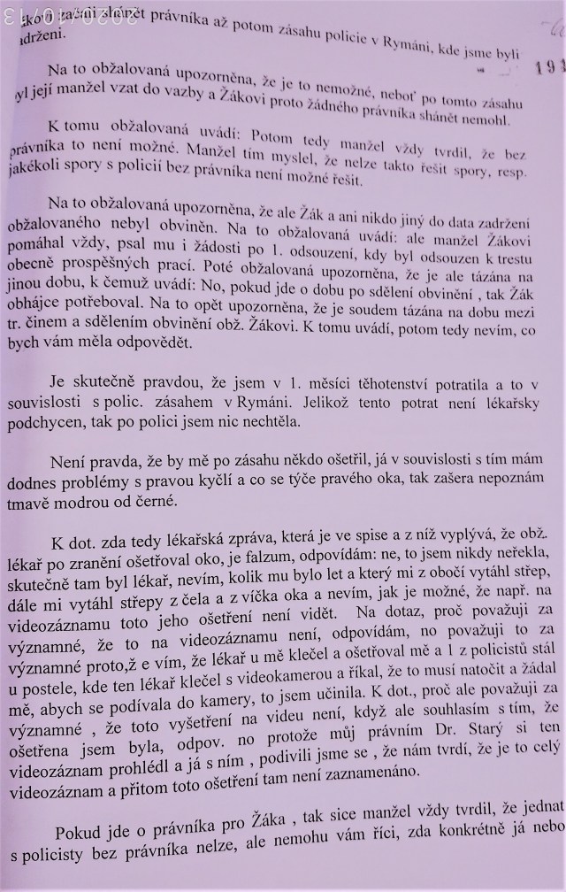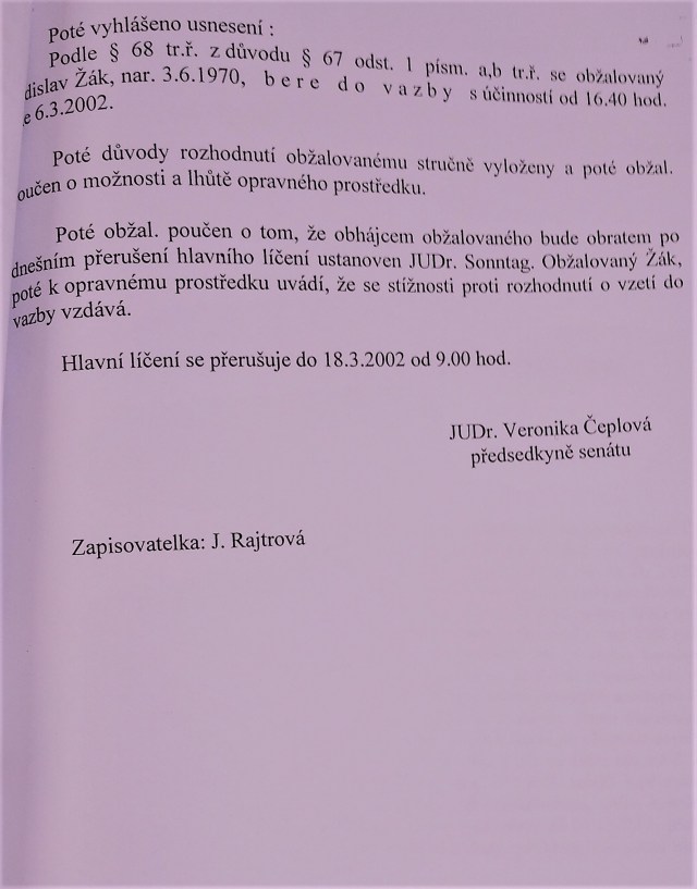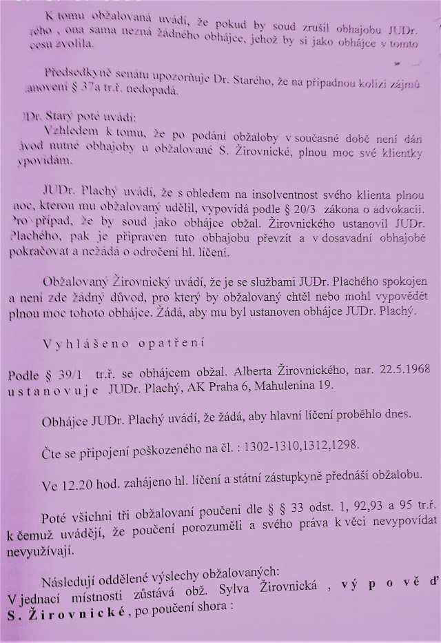 Až bylo po všem, na konci jednání dne 6.3.2025 byla upozorněna, že by obhájce mít měla, a kromě jiného L. Žák byl vzat do vazby (ačkoliv byl nakonec ze strany Vrchního soudu v Praze zproštěn).