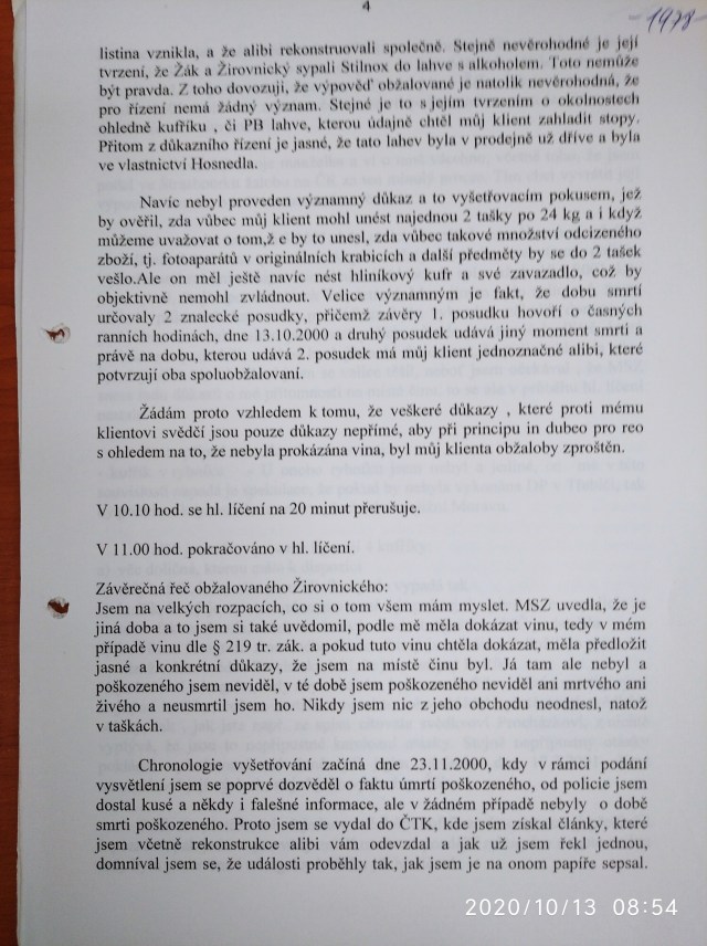 Jestliže tedy tvrdím a tvrdil jsem i tehdy, že celé přípravné řízení bylo prováděno NEZÁKONNĚ, nebylo na mě, abych jakýmkoliv způsobem verifikoval informace z nezákonných výpovědí pořízených Policií ČR, když POVINNOST dokázat mi vinu, tedy alespoň můj pohyb na místě činu v době smrti Pišty, BYLA NA STÁTNÍM ZASTUPITELSTVÍ.