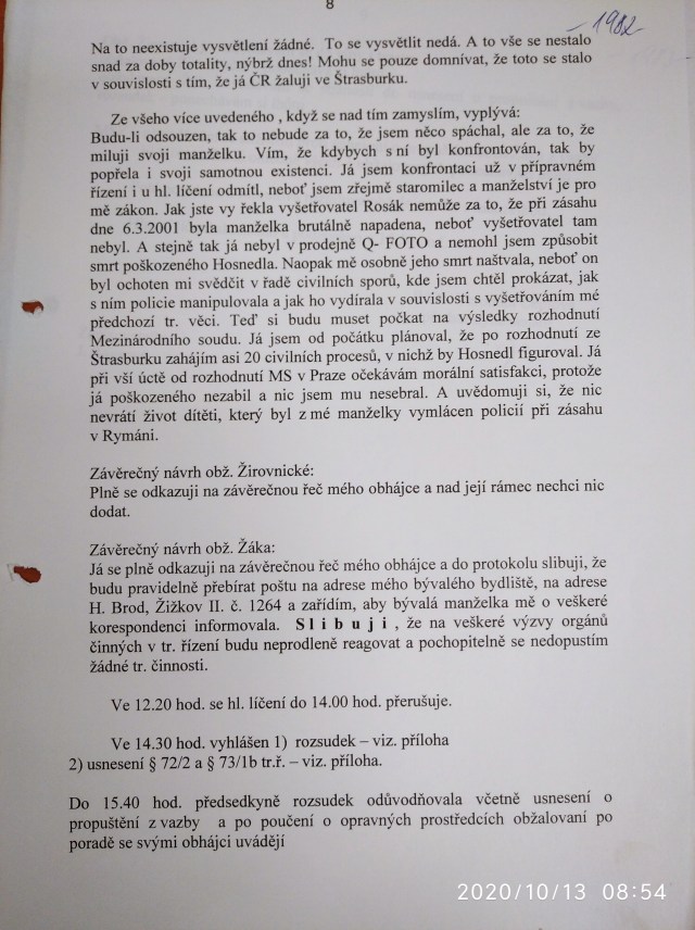 Navíc pak mohu poskytnout Přílohu D), což je Protokol před MS v Praze ze dne 25.3.2002, tedy den, kdy nejprve byly předneseny Závěrečné řeči, pak však došlo k dalšímu výslechu všech obžalovaných, a následovaly znovu Závěrečné řeči, a byl vyhlášen rozsudek, na který moje ex manželka v soudní síni zareagovala slovy, určenými přítomným policajtům z mordparty: „To vám tedy pěkně děkuju.“ Tato věta byla dokonce zachycena přítomnými novináři a je dohledatelná na internetu.