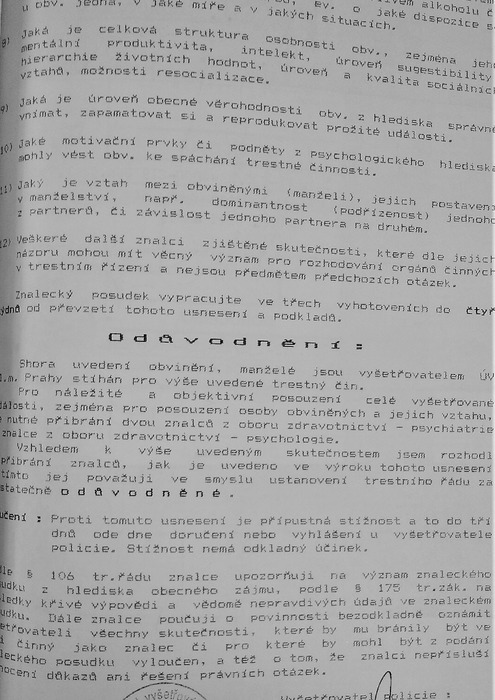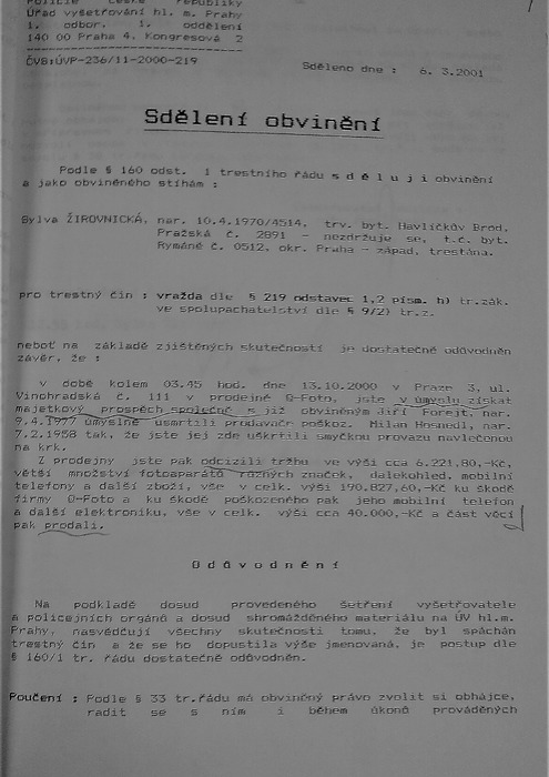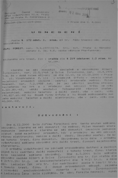 Moje tehdejší manželka však byla „obviněna (ze spáchání vraždy také) ve spolupachatelství s Jiřím Forejtem“ (viz. Příloha A.), nikoliv se mnou. A toto se v průběhu vyšetřování nikdy nezměnilo. Stejně, se nezměnila v jakémkoliv obvinění „doba úmrtí ‚okolo 3: 45 hod. dne 13.10.2000′“. Otázkou je, co vlastně policajti vyšetřovali?