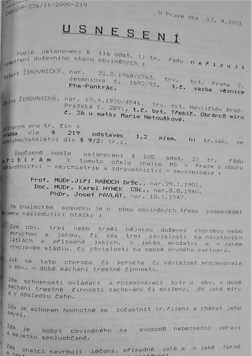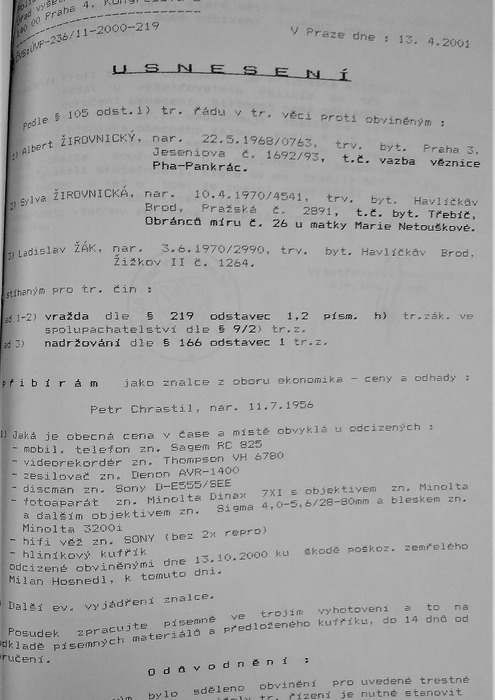 Příloha D., což je usnesení o přijetí znalců ze dne 13.4.2025 (zde je nutno upozornit, což bude řešeno později, že v tomto rozhodnutí rozhodl sám VYŠETŘOVATEL, že hliníkový kufřík byl Pišty, ačkoliv tento kufřík NIKDO ZE SVĚDKŮ NEIDENTIFIKOVAL, JAKO PIŠATŮV KUFŘÍK);Příloha E., usnesení o přijetí znalců ze dne 13.4.2001;