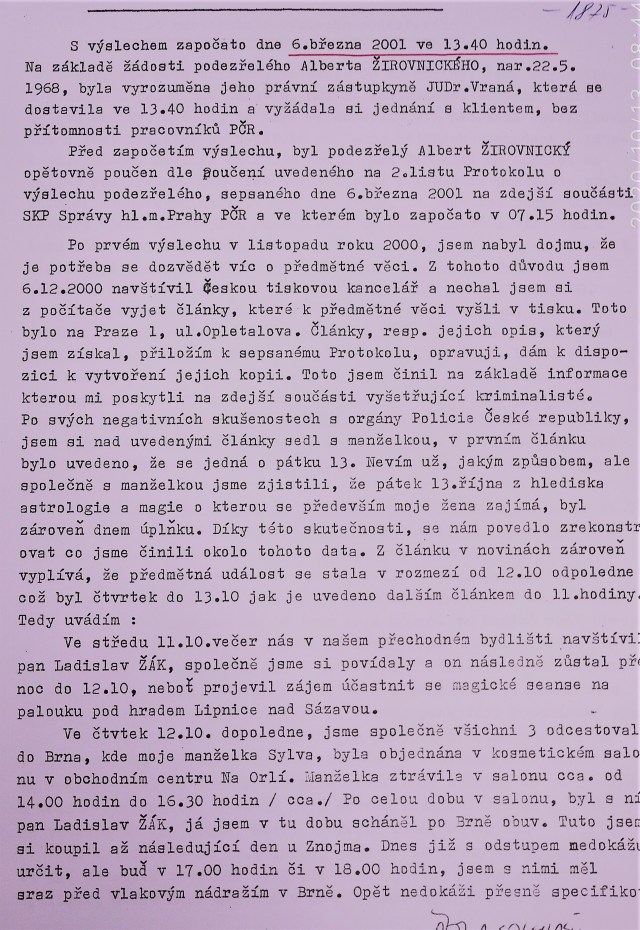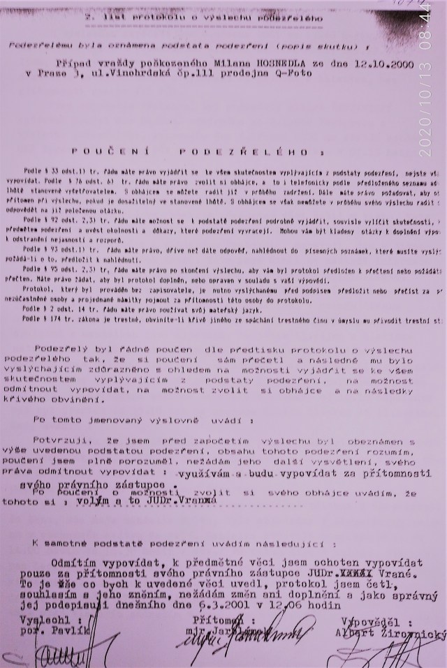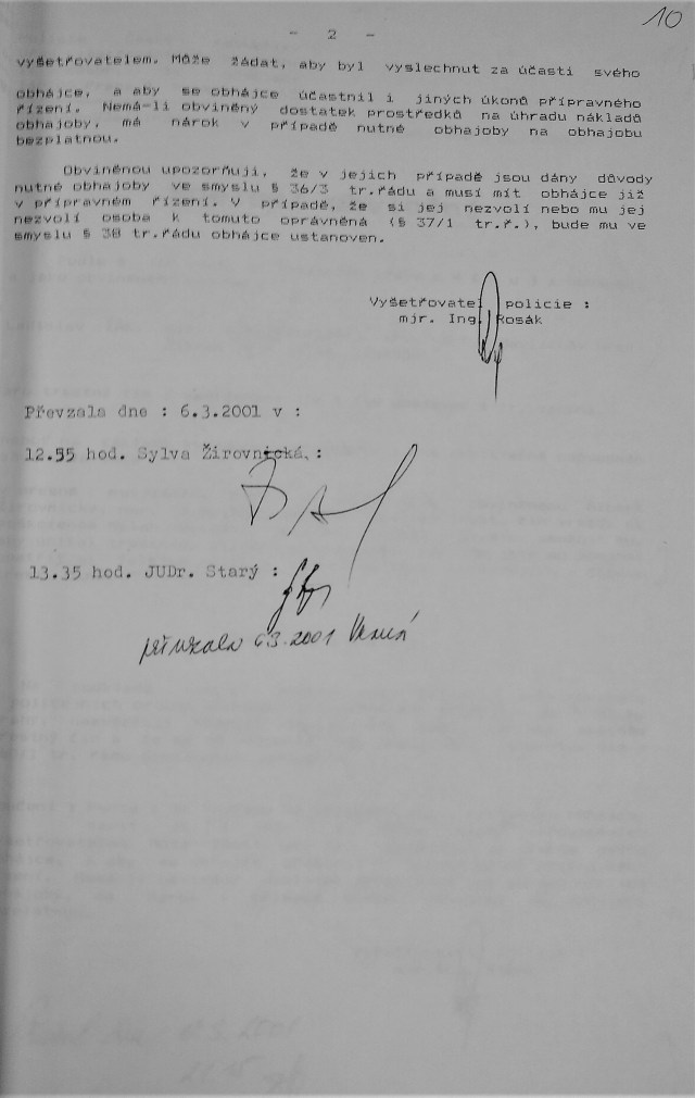 Nicméně, velmi důležitý údaj je, že jsem byl panem Pavlíkem vyslýchán od 13:40-14:58 hodin, a to v přítomnosti JUDr. Vrané, advokátky, která měla ode mě podepsanou plnou moc.