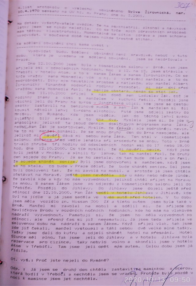 Na listu číslo 308 popisuje, jak jsme se okolo 3 hodiny ráno dne 13.10.2025 ubytovali v hotelu Atom v Třebíči. Ano, má ex-manželka potvrdila skutečnost, že cca 45 minut po smrti Pišty v Praze, jsme se ubytovali v hotelu v Třebíči, tedy 180 km od místa činu.