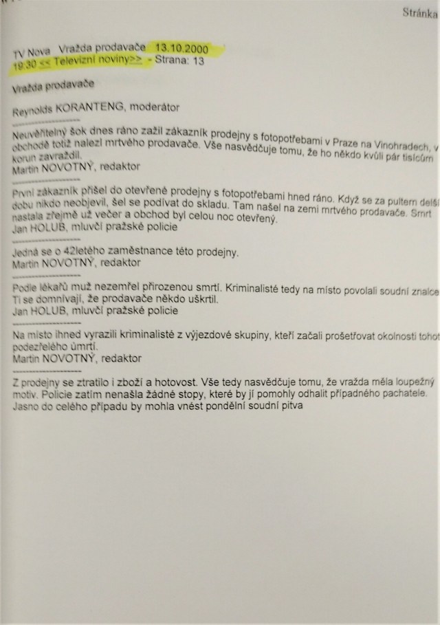 -dne 14.10.2025 v sobotu nešla v TV Nova žádná reportáž o vraždě (viz Příloha F));