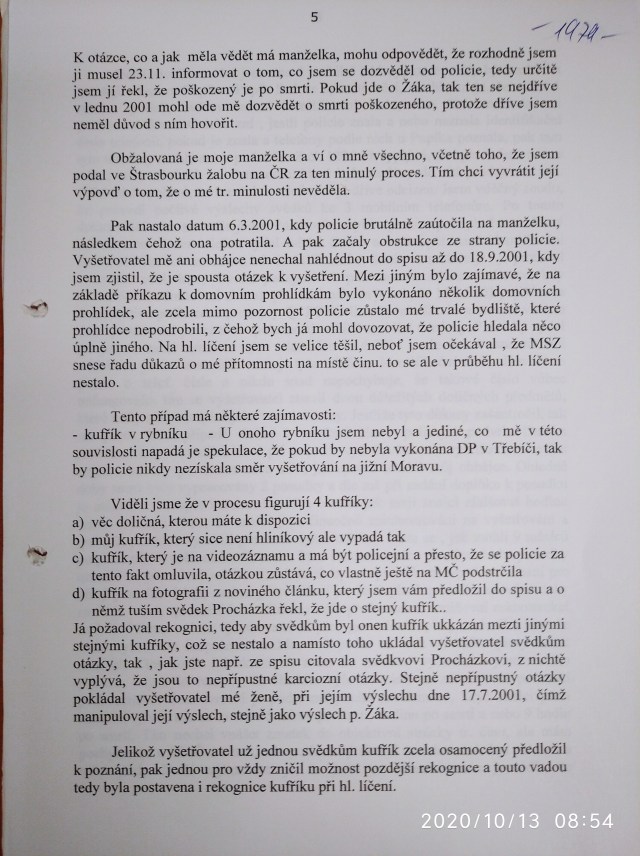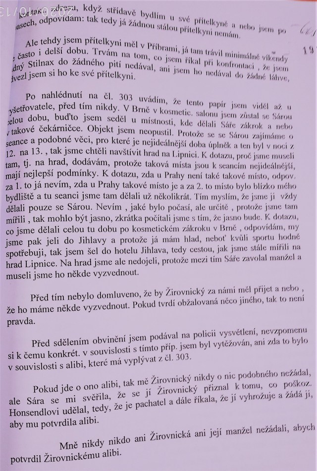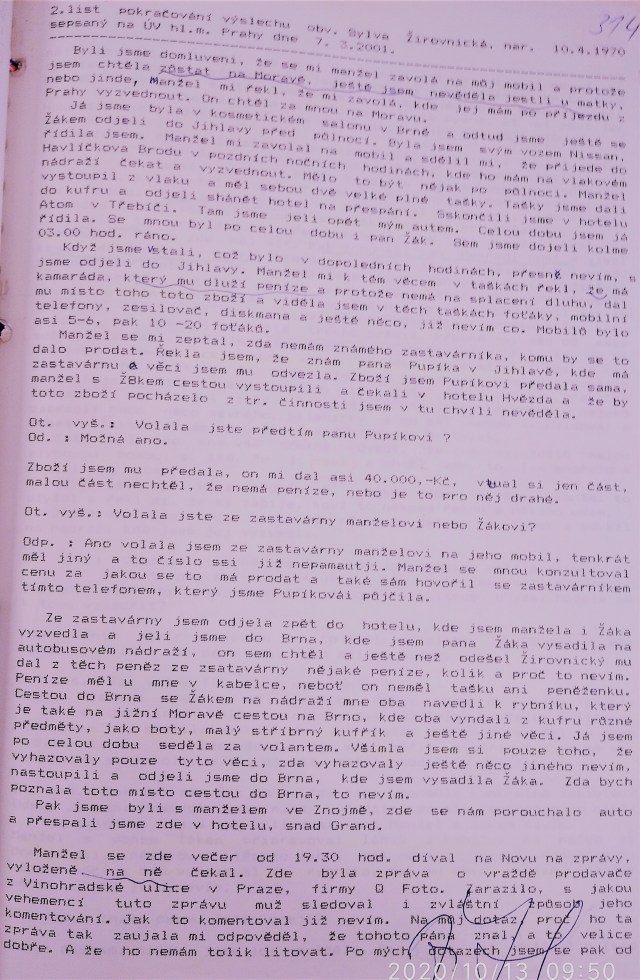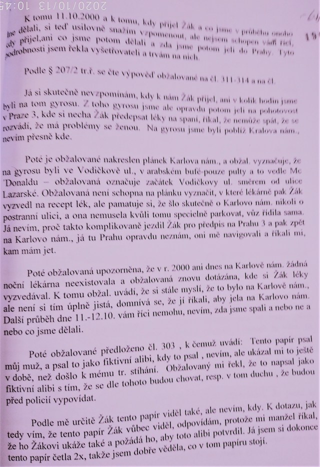 Nejprve úvodem výslechu uvádí, že: „poslední dva roky byla nezaměstnaná, ale má příjem 20.-25.tisíc čistého, jede na kosmetiku do Brna, přespáváme v hotelech a jíme v restauracích, ale já nepřispívám do rodinného rozpočtu…. Z kosmetiky v Brně jedou do Třebíče a z Třebíče do Jihlavy, ale zůstává na Moravě, neboť se chce zastavit den poté, za matkou a dcerou v Třebíči, ale přesto odjela do Jihlavy shánět nocleh….Po odjezdu z hotelu Atom jsme měli jet do Jihlavy, protože mi tam někdo dlužil peníze, a dal mi za to zboží, ačkoliv jsem s taškami se zbožím měl přijet do Havlíčkova Brodu den předtím…“ A nakonec jsem: „nechal manželku samotnou (ačkoliv jsem jí dle jejích slov nevěřil) vykládat tašky u zastavárníka a samotnou jí je nechávám zpeněžovat což koordinuji po mobilu“ (který jsem tehdy nejen neměl, ale já ho ani nechtěl). „Házeli jsme věci do rybníka, boty a kufřík a další (proč na Moravě, kdy veškeré věci popisuje jako „zjevené věci“; Auto bylo její, ale náhle se v kufru objevily boty kufr apod., ačkoliv před tím popisovala, jak jsme všichni dávali do kufru tašky, co jsem přivezl z Prahy a ona pak s těmi taškami manipulovala u zastavárníka.“