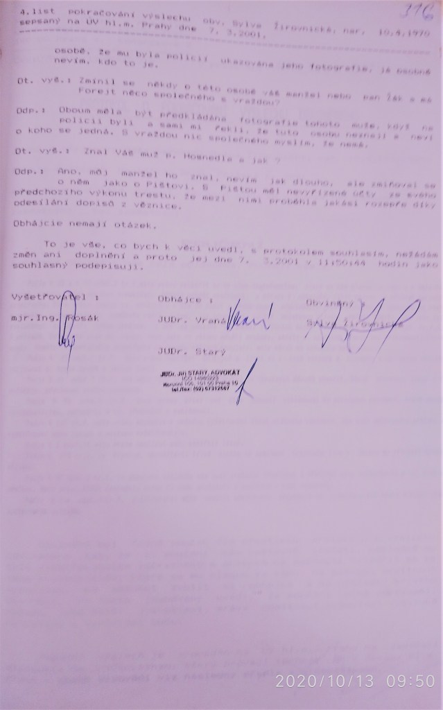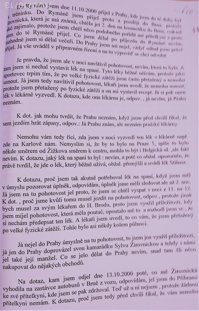 Ano, je též na místě připomenout, že má ex manželka vypovídala ještě několikrát, a to ve dnech: 7.3. a 11.7.2001. Abych byl tedy otevřený a transparentní, jako Přílohu A) zde přikládám Protokol ze dne 7.3.2001, listy čísel 313-316, na kterých má exmanželka popisuje průběh usmrcení Pišty, jak jsem jí ho „měl vyprávět“ v hotelu Grand ve Znojmě, po shlédnutí televizních novin, dne 14.10.2001. Nechť se na mě čtenář již nezlobí, ale nebudu se vracet k tomu, že tato výpověď „z doslechu (hearsay evidence)“ je objektivně nepravdivá, když policajti neověřili ani skutečnost, že ve Znojmě NEEXISTUJE HOTEL GRAND, ve kterém jsme se měli dívat na televizní noviny, které 14.10.2025 v televizi NEBĚŽELY.