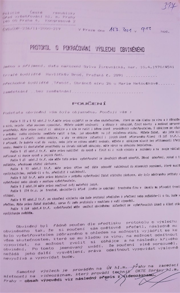 Pokud pak jde o výslech dne 11.7.2001, přikládám Přílohu B), ze které jasně vyplývá, že byl pořizován video výslech, kdy mé ex manželce byly pouštěny „vytržené kousky odposlechů“ (například i oněch ilegálních z našeho domova a telefonních, které však též nebyly prováděny na základě nějakého „Příkazu soudu“) a ona se k těmto vyjadřuje. Bohužel, tuto sekci budu muset zpracovat později, neboť si nedovedete představit, jak je dnes obtížné získat tento videozáznam, který je stále na VHS v péči soudu. Avšak jeho obsah je taky pěkná prča.