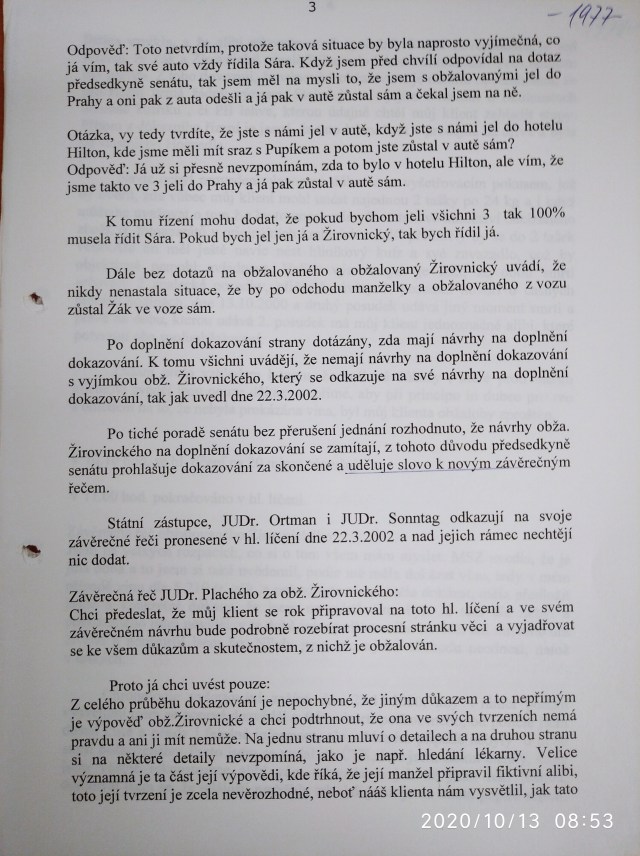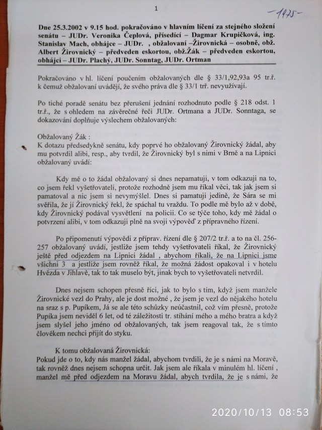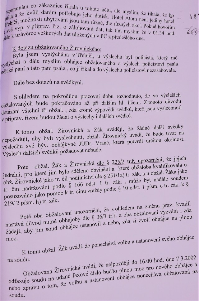 Až bylo po všem, na konci jednání dne 6.3.2025 byla upozorněna, že by obhájce mít měla, a kromě jiného L. Žák byl vzat do vazby (ačkoliv byl nakonec ze strany Vrchního soudu v Praze zproštěn).